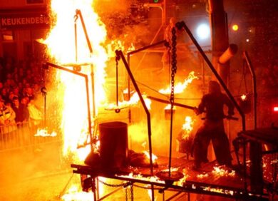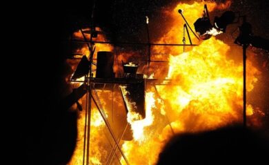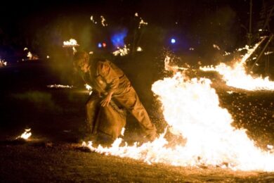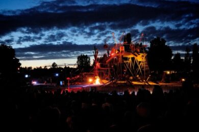 Doedel est une compagnie hollandaise qui jubile, honore, manipule et se joue allègrement du feu à travers une scénographie monumentale. Et son ivresse à composer une multitude de variations sur ce thème, nous entraîne dans un monde industriel à la rencontre d’éléments très différenciés tels que l’eau et le métal, dans une rencontre où la réalité et la fiction se croisent et se mélangent. Au milieu des cris, des hurlements aigus des machines, dans un dialogue constant entre les percussionnistes et les jaillissements de feu, une explosion imminente gronde. Dans la fabrique, chacun prend alors part à une expérience visuelle presque primitive dans une chaleur lourde, sauvage dans laquelle le feu, façonné à chaque fois de façon différente, brûle comme un symbole tangible de l’éternité.