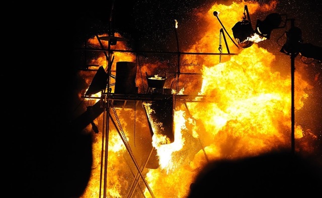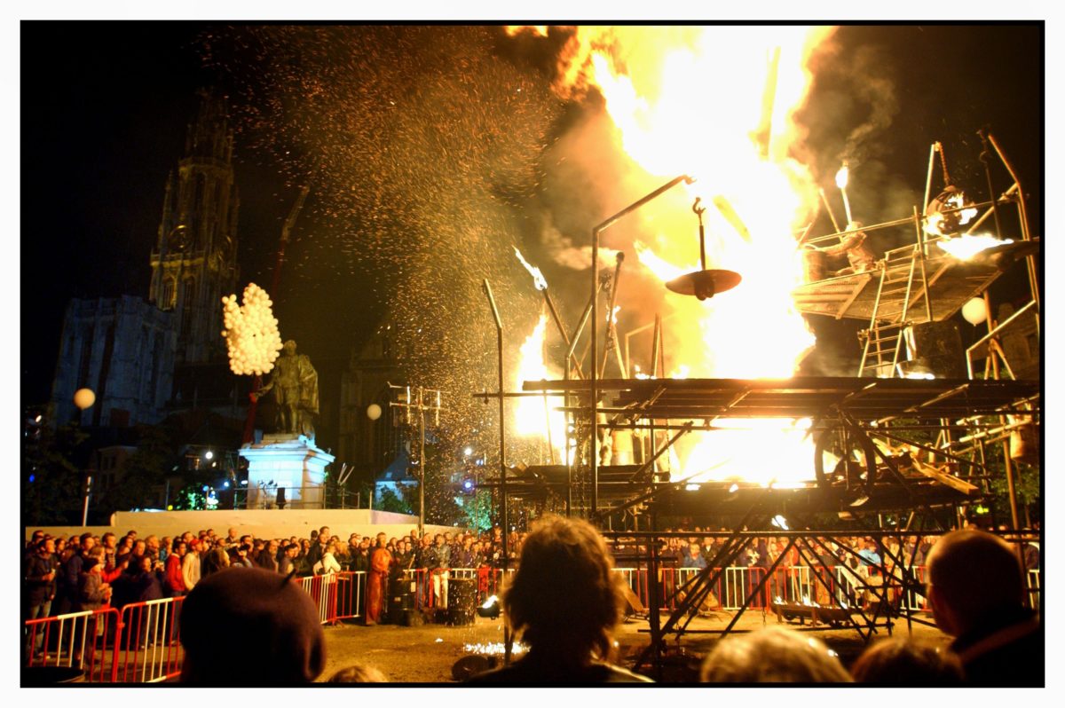 Doedel est une compagnie hollandaise qui jubile, honore, manipule et se joue allègrement du feu à travers une scénographie monumentale. Et son ivresse à composer une multitude de variations sur ce thème, nous entraîne dans un monde industriel à la rencontre d’éléments très différenciés tels que l’eau et le métal, dans une rencontre où la réalité et la fiction se croisent et se mélangent. Au milieu des cris, des hurlements aigus des machines, dans un dialogue constant entre les percussionnistes et les jaillissements de feu, une explosion imminente gronde. Dans la fabrique, chacun prend alors part à une expérience visuelle presque primitive dans une chaleur lourde, sauvage dans laquelle le feu, façonné à chaque fois de façon différente, brûle comme un symbole tangible de l’éternité.