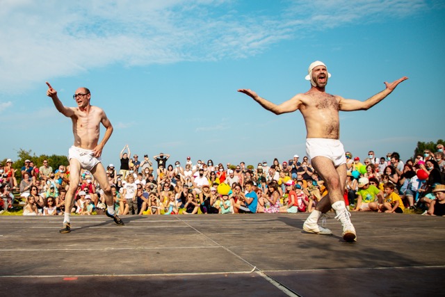 Dans un rapport d’immédiate complicité avec le public, ils enchainent des portés acrobatiques teintés d’un humour à la nonchalance déroutante, tout en restant d’une écoute sans pareil pour les événements de la rue qui viendront ponctuer la représentation, offrant la fraîcheur des improvisations et la magie des surprises à un public souvent hilare